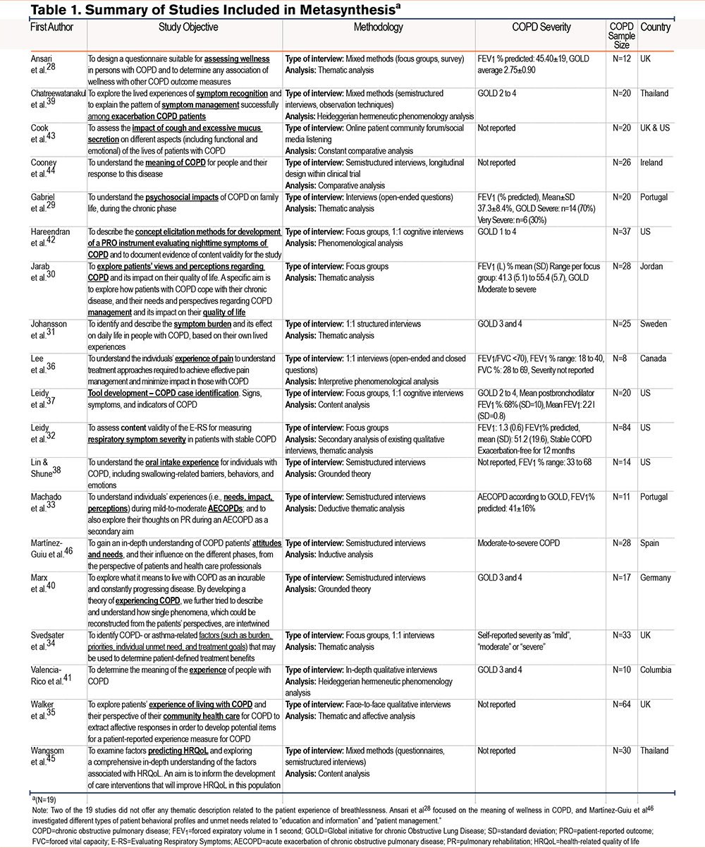 Table 1 summarizes the characteristics of eligible studies28-46 and presents qualitative research from 11 countries: the United States, the United Kingdom, Canada, Colombia, Germany, Ireland, Jordan, Portugal, Spain, Sweden, and Thailand. Each study explored an aspect of the patient experience of living with COPD. Study objectives included understanding the symptom burden of COPD, exploring perceptions about the meaning of COPD, identifying unmet needs, and assessing the impacts on specific symptoms (e.g., cough, mucus). Study design methods included individual or semi-structured interviews (12, 63.2%), focus groups (5, 26%), a combination of both focus group/ semi-structured interviews (1, 5.2%), and social media listening (1, 5.2%). Of these, 2 studies included qualitative methods as part of a mixed methods survey and 2 were part of instrument development studies which combined focus groups and cognitive interviews. Thematic analysis was the most common method for qualitative analysis (8, 42.1%).28-35