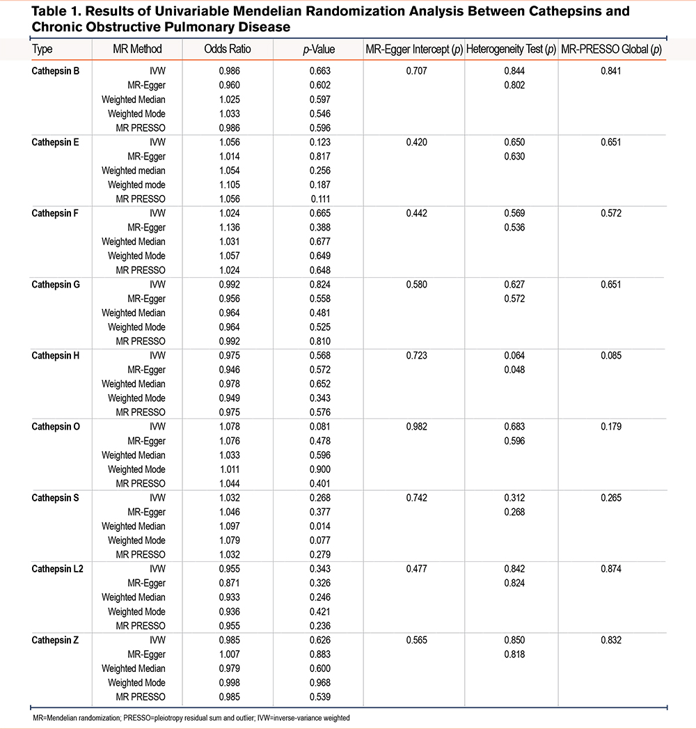 Citation: Duan C, Zhang A, Tian S. Genetic evidence for causal relationships between circulating cathepsin levels and chronic obstructive pulmonary disease: a Mendelian randomization study. Chronic Obstr Pulm Dis. 2025; 12(5): 380-389. doi: http://doi.org/10.15326/jcopdf.2025.0626