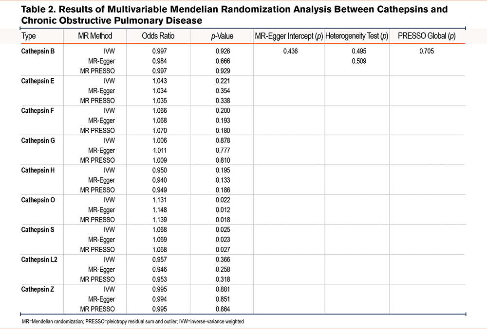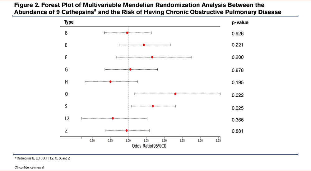 To our knowledge, this study represents the first MR study to systematically investigate the causal relationship between circulating cathepsin levels and COPD risk. Our findings suggest that elevated levels of cathepsins O and S may serve as independent risk factors for COPD development, though these observations require further validation.