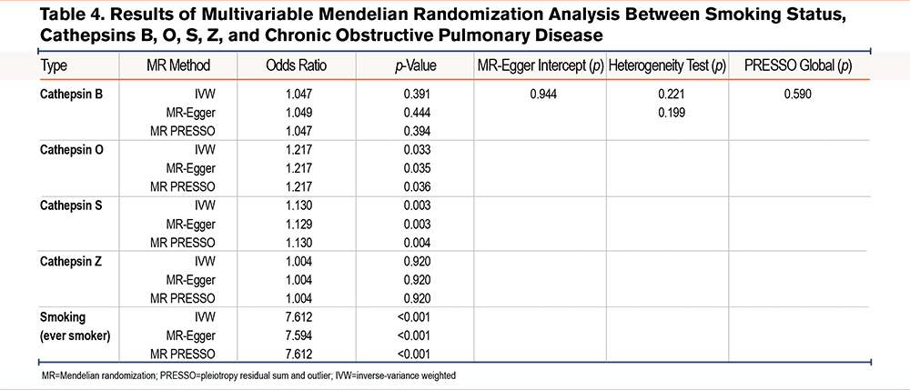 Furthermore, given that COPD is a heavily smoking-mediated disease, we also performed a MVMR using smoking and cathepins B, O, S, and Z as covariates. The analysis results indicated that after adjusting for smoking status, both cathepsins O and S were genetically related to COPD risk. Specifically, OR was estimated as 1.217 (p=0.033, 95% CI =1.096–1.458) for cathepsin O and 1.130 (p=0.003, 95% CI=1.043–1.224) for cathepsin S while OR for smoking was as 7.614 (p<0.001, 95% CI =3.819–15.180) by IVW, respectively (Table 4).