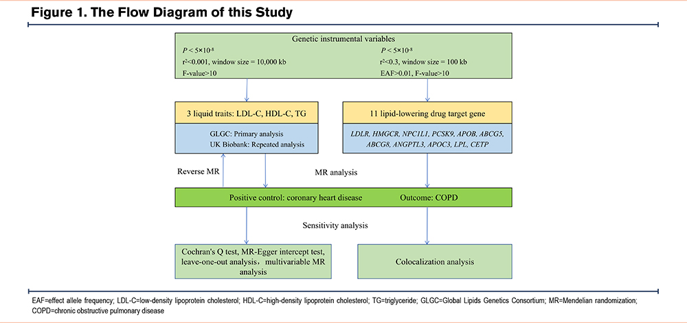 In this study, we utilized 2-sample MR to investigate the causal relationships between serum lipid levels and COPD. We also performed drug target MR to assess the impact of lipid-lowering drug target genes on COPD. To ensure the robustness of our results, we conducted several MR sensitivity analyses, including the MR-pleiotropy residual sum and outlier (MR-PRESSO) test, Cochran's Q test, MR-Egger intercept test, leave-one-out analysis, multivariable MR analysis, and colocalization analysis.