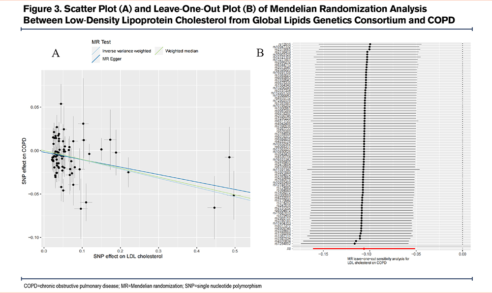 The mechanism by which statins influence COPD, particularly whether this effect is attributable to lipid-lowering, remains unclear. Our study identified a causal association between elevated LDL-C levels and a reduced risk of COPD, suggesting that LDL-C may function as a protective factor. This implies that the protective effects of statins on COPD may not be linked to their lipid-lowering properties, and that lowering LDL-C levels might instead increase the risk of COPD. Supporting our findings, a Danish population study demonstrated that lower LDL-C levels are associated with a higher risk of COPD.9 Additionally, in examining the impact of lipid-lowering drug target genes on COPD, we found causal associations between 2 LDL-C-related genes—HMGCR and PCSK9—and a reduced risk of COPD. Similar observations were made by Holmes et al who reported that PCSK9 gene variants, while reducing LDL-C levels and cardiovascular risk, increased the risk of COPD.41 Based on these findings, we hypothesize that statins may exert dual effects on COPD. While their lipid-lowering properties could increase the risk of COPD, their anti-inflammatory and immunomodulatory actions might offer protective benefits. Therefore, future research on statin therapy in COPD should consider baseline serum LDL-C levels. Statins with comparatively weaker lipid-lowering but stronger anti-inflammatory effects may yield more favorable outcomes. Further validation through well-designed studies is warranted.