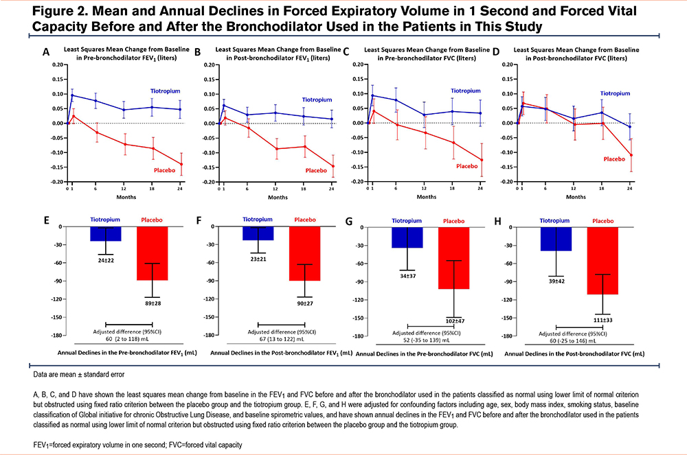 Figure 2 shows that the tiotropium group exhibited lower lung function decline from baseline to 24 months than the placebo group, as shown by the pre- and postbronchodilator FEV1 and/or FVC values. The annual decline in prebronchodilator FEV1 in the tiotropium group was lower than in the placebo group (24mL/year versus 89mL/year, respectively; adjusted difference 60mL/year; 95% CI 2, 118) from 30 days through 24 months. Similar results were observed for the postbronchodilator FEV1. The between-group adjusted difference from 30 days through 24 months in the annual decline in postbronchodilator FEV1 was 67mL/year (95% CI 13, 122), with an annual decline of 23mL/year in the tiotropium group compared with 90mL/year in the placebo group. Tiotropium reduced the annual decline in prebronchodilator FVC compared with placebo (34mL/year versus 102mL/year, respectively; adjusted difference 52mL/year; 95% CI -35, 139); however, this result was not statistically significant. Similarly, tiotropium insignificantly reduced the annual decline in postbronchodilator FVC compared with placebo (39mL/year versus 111mL/year; adjusted difference 60mL/year; 95% CI -25, 146) from 30 days through 24 months.