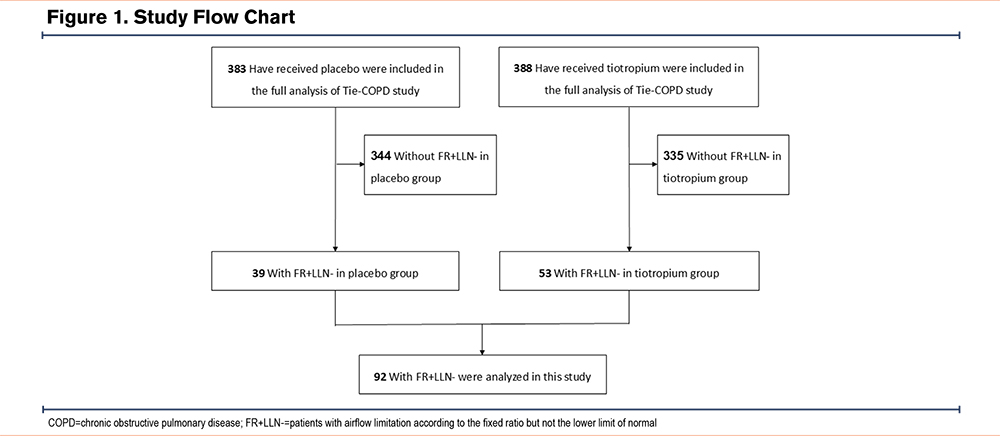 Our team previously conducted the Tiotropium in Early Chronic Obstructive Pulmonary Disease Patients in China (Tie-COPD) study, which did not use ≥LLN as an exclusion criterion. Owing to the lack of evidence on the effectiveness of tiotropium in patients with COPD with FR+LLN-, we conducted this secondary analysis of the Tie-COPD study using the baseline and follow-up data of patients with COPD with FR+LLN- treated with tiotropium to explore whether tiotropium improved respiratory health outcomes in this population.