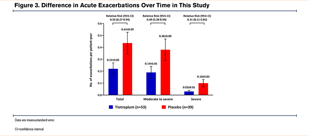The annual frequency of acute COPD exacerbations was lower in the tiotropium group than in the placebo group (0.22 ± 0.05 per patient year versus 0.43 ± 0.09 per patient year, respectively; relative risk [RR]=0.50; 95% CI, 0.27–0.94). Similar results were observed for moderate-to-severe COPD exacerbations (0.19 ± 0.05 per patient year versus 0.38 ± 0.09 per patient year; RR=0.49; 95% CI, 0.28–0.94) and severe COPD exacerbations requiring hospitalization (0.03 ± 0.01 per patient year versus 0.10 ± 0.03 per patient year; RR=0.31; 95% CI, 0.11–0.85) (Figure 3).