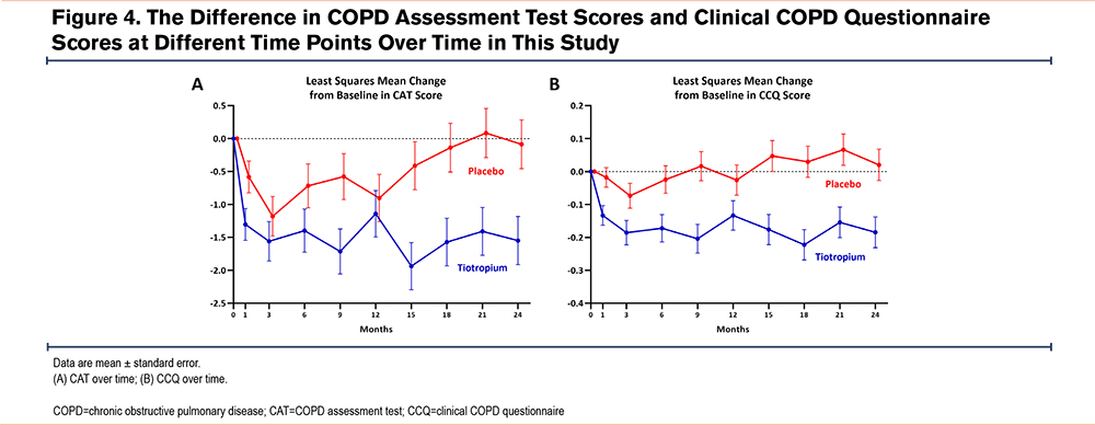 As for chronic respiratory symptoms, the tiotropium group demonstrated significantly reduced CAT scores from baseline to 24 months (LSM change -1.55; 95% CI -2.26, -0.83) compared with the placebo group (LSM change -0.09; 95% CI -0.82, 0.64). The between-group difference was -1.92 (95% CI -2.85, -1.00) (Figure 4). The LSM change in the CCQ score from baseline to 24 months in the tiotropium group was -0.22 (95% CI -0.34, -0.10) compared with 0.02 (95% CI -0.07, 0.11) in the placebo group. The between-group difference was -0.18 (95% CI -0.28, -0.09).