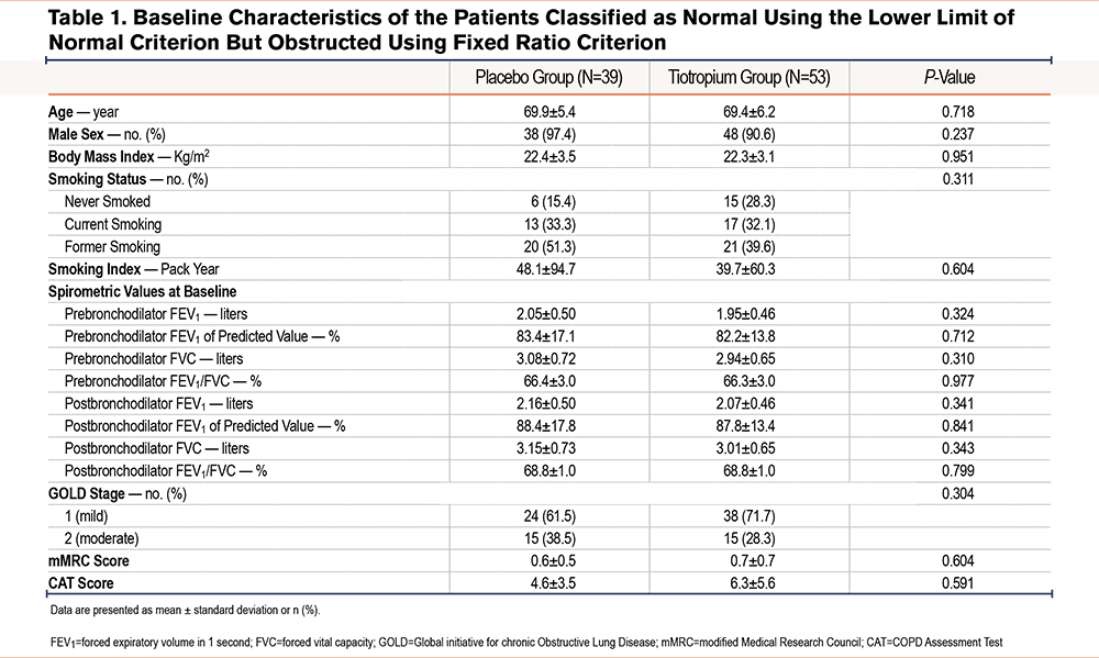 The secondary analysis revealed that tiotropium improved lung function, and reduced lung function decline, exacerbations, and chronic respiratory symptoms compared with placebo in patients diagnosed with airflow limitation according to the commonly used FR of 0.70 but not the LLN.