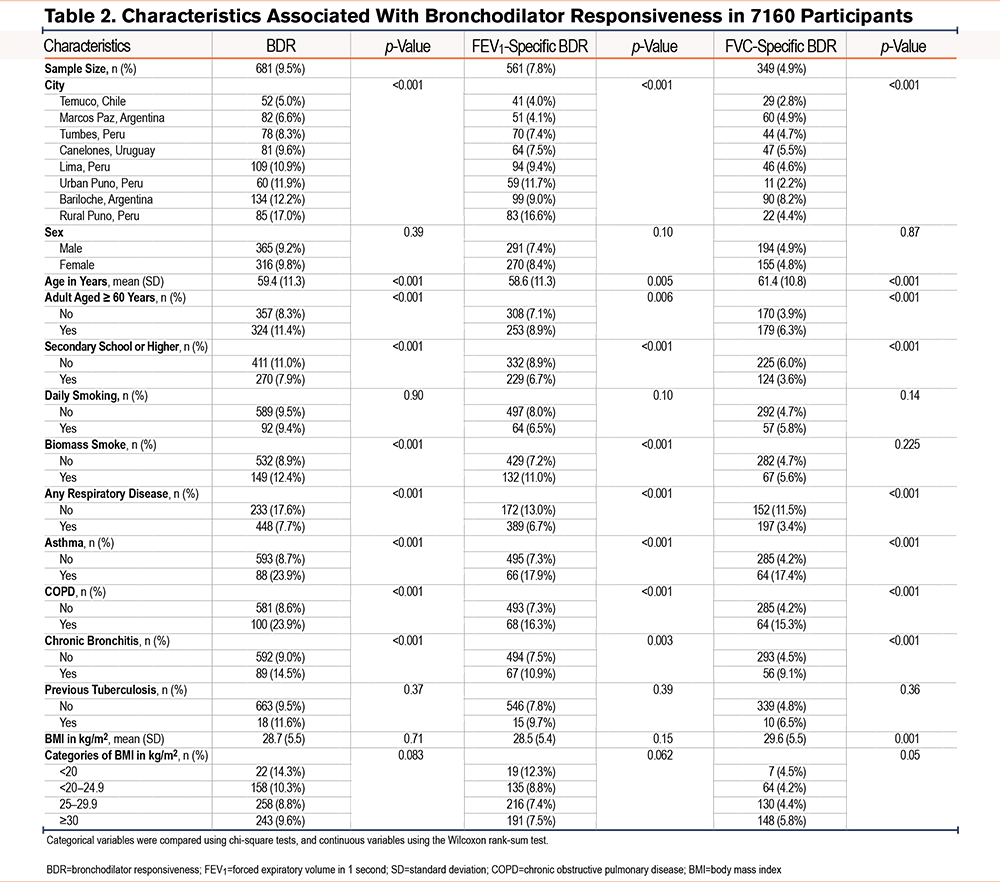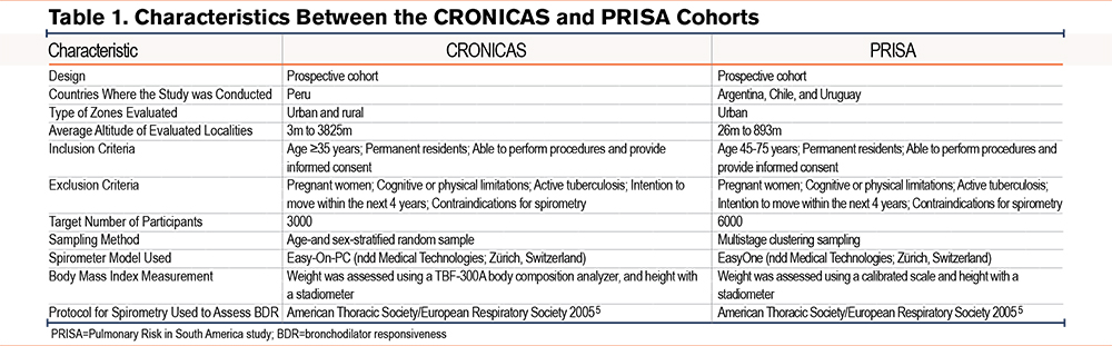 Data collection teams in both studies received spirometry training and were subsequently evaluated to ensure proficiency in the procedure and the performance of high-quality tests. In both studies, field staff visited the homes of participants selected through sampling as described above. Those who met the eligibility criteria were invited to participate in the study, and those who agreed provided informed consent. Spirometry was performed according to the 2005 American Thoracic Society (ATS)/European Respiratory Society guidelines.23 FEV1, forced vital capacity (FVC), and FEV1/FVC were measured before and after administering 200µg of inhaled salbutamol. This procedure was conducted using Easy-On-PC spirometers in the CRONICAS study and EasyOne spirometers in the PRISA study (ndd Medical Technologies; Zurich, Switzerland). These spirometers are commonly used for lung function evaluation in research studies and have been shown to maintain accuracy over time.24 BDR was evaluated using FEV1 and FVC measurements. In this study, we defined BDR by ATS criteria as a postbronchodilator increase of ≥12% and ≥200mL in either FEV1 or FVC.25 We also evaluated FEV1-specific BDR and FVC-specific BDR separately, using the same thresholds applied to each parameter independently.