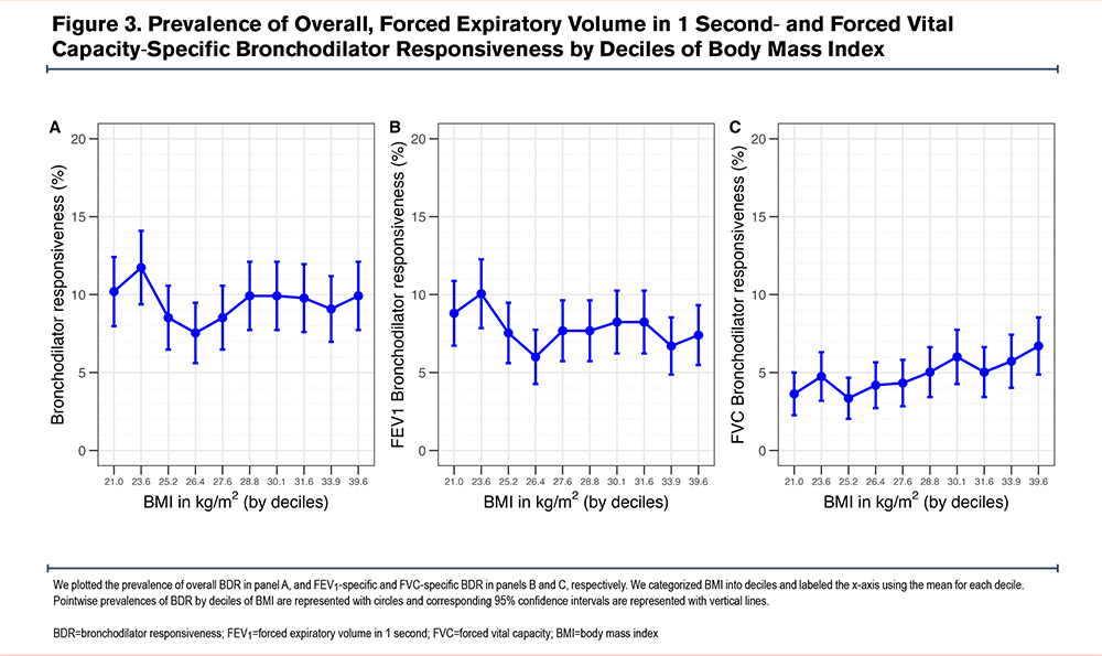 We also plotted the prevalence of BDR by BMI deciles (Figure 3). The prevalence, which averaged 9.5%, dropped to about 4% between 24 and 28kg/m2. A similar decline was observed in FEV1-specific BDR within the same BMI range. In contrast, FVC-specific BDR showed a progressive increase starting at approximately 25.2kg/m2.