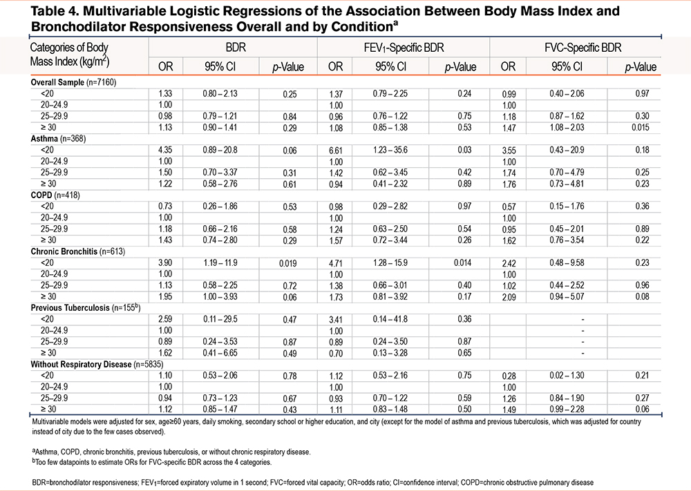 After adjusting for potential confounders, participants with a BMI ≥30kg/m2 had higher odds of FVC-specific BDR (1.47, 95% CI 1.08–2.03), compared to those with BMI 20–24.9kg/m2. In stratified analyses, participants with a BMI <20kg/m2 and asthma (6.61, 1.24–35.6) or chronic bronchitis (4.71, 1.28–15.9) had a higher odds of FEV1-specific BDR. Participants with a BMI <20kg/m2 and chronic bronchitis also had a higher odds of BDR (3.90, 1.19–11.9) (Table 4).