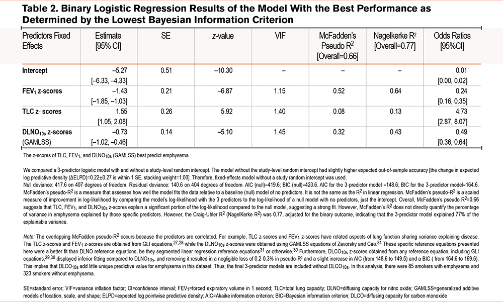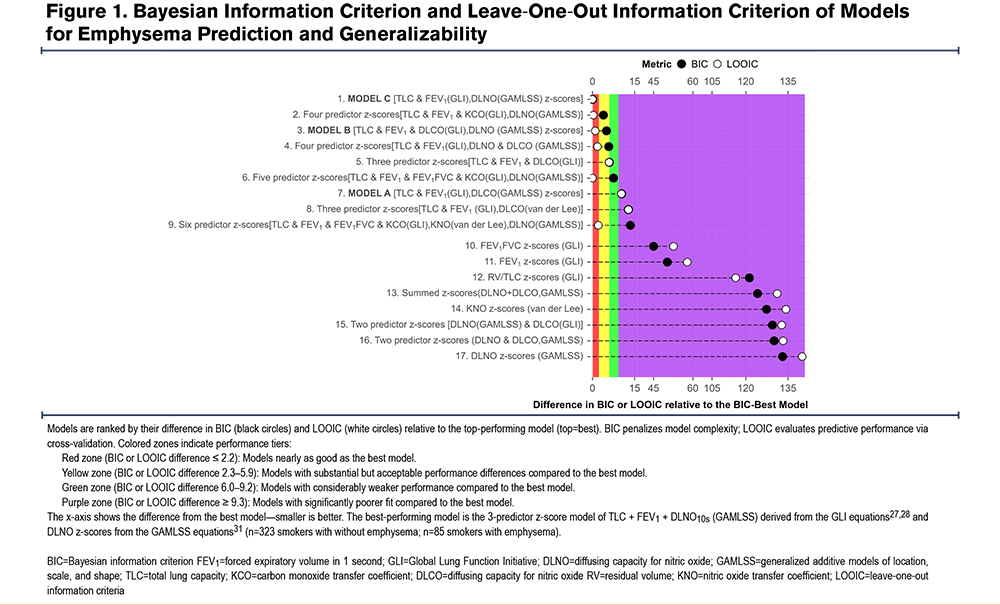 Abbreviations: AIC=Akaike information criterion; AUROC=area under the receiver operating characteristic; BH=Benjamini-Hochberg procedure; BIC=Bayesian information criterion; BMI=body mass index; CI=confidence interval; CO=carbon monoxide; CT=computed tomography; DLCO=diffusing capacity for carbon monoxide; DLNO=diffusing capacity for nitric oxide; ELPD=expected log pointwise predictive density; FDA=U.S. Food and Drug Administration; FDR=forced discovery rate; FEV1=forced expiratory volume in 1 second; FVC=forced vital capacity; GAMLSS=generalized additive models of location, scale, and shape; GLI=Global Lung Function Initiative; Hb=hemoglobin; IDI=integrated discrimination index; IPD= individual patient data; IQR=interquartile range; IV=inspired volume; LR=likelihood ratio; KCO=carbon monoxide transfer coefficient; KNO=nitric oxide transfer coefficient; LASSO=least absolute shrinkage and selection operator; MCC=Matthews correlation coefficient; LOOIC=leave-one-out information criteria; NO=nitric oxide; NPV=negative predictive value; NRI= net reclassification improvement; OFF=out of fold; PC=principal component; PCA=principal component analysis; PFTs=pulmonary function tests; PPV=positive predictive value; PSiS=Pareto-smoothed importance-sampling; RBC=red blood cell; RV=residual volume; SE=standard error; SLR=segmented linear regression; TLC=total lung capacity; ULN=upper limit of normal defined as the 95th percentile; VA=alveolar volume; VIF=variance inflation factor