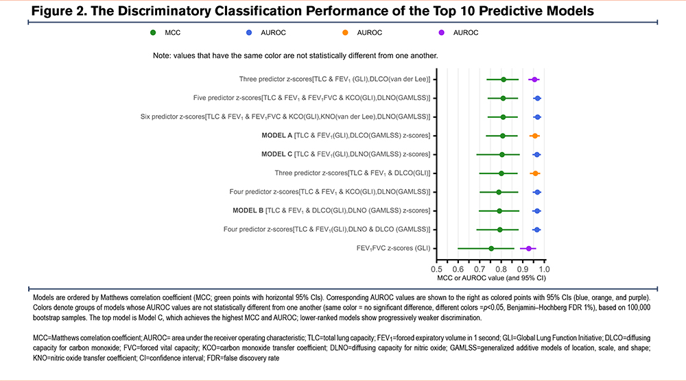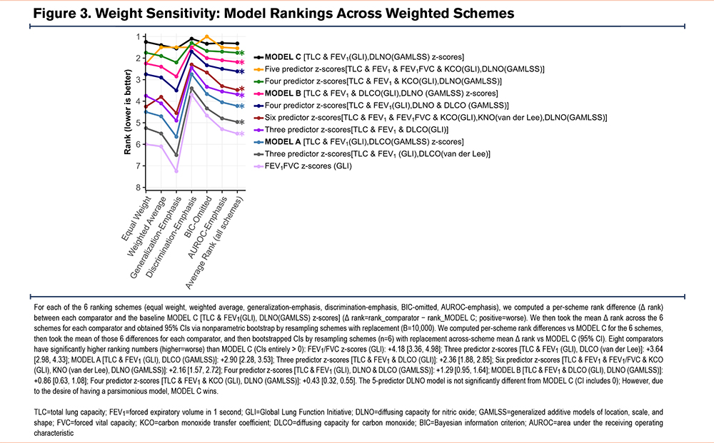Across schemes, 8 out of 9 comparators ranked significantly worse than the best ranked model (Model C, Δ rank > 0; 95% CI is >0). The 5-predictor DLNO model was the only top 10 model that had a ranking that was not different to Model C. (Δ=+0.22 [−0.09, 0.57]). As such, Model C (TLC z-scores, FEV1 z-scores, and DLNO10s z-scores) offered near-top performance yet delivered comparable discrimination/generalization with fewer predictors with greater parsimony than any other model. Thus, Model C is the best choice (Figure 3).