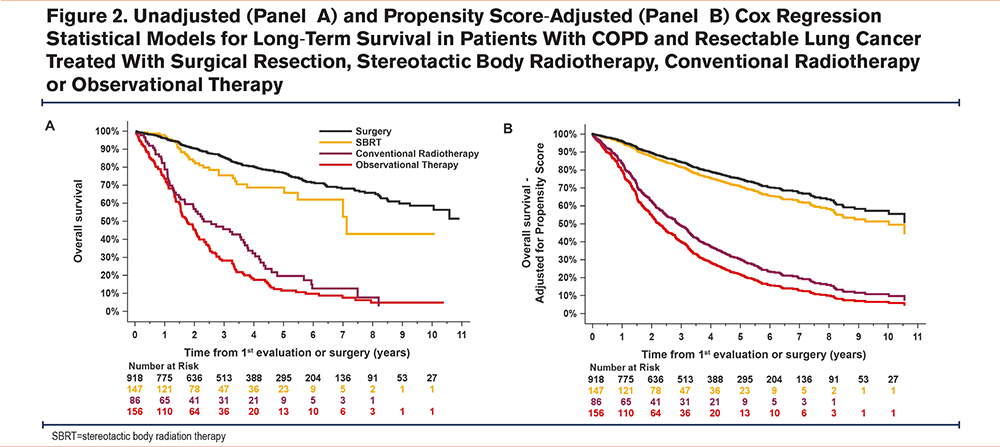 It remains unclear whether less favorable outcomes associated with the nonsurgical approaches are due to cancer progression or complications from severe comorbidities that underlie the decision for no surgery. To address this question, we had access to the mortality causes of the entire cohort (Table 3). We also explored the causes of mortality according to each type of nonsurgical treatment. The results are concordant with an excess lung cancer mortality with conventional radiotherapy and therapeutic abstention but not with SBRT. This observation further reinforces the benefit of lung resection even in patients with a comorbid condition, such as COPD, while supporting the notion that SBRT is an adequate alternative to surgery.