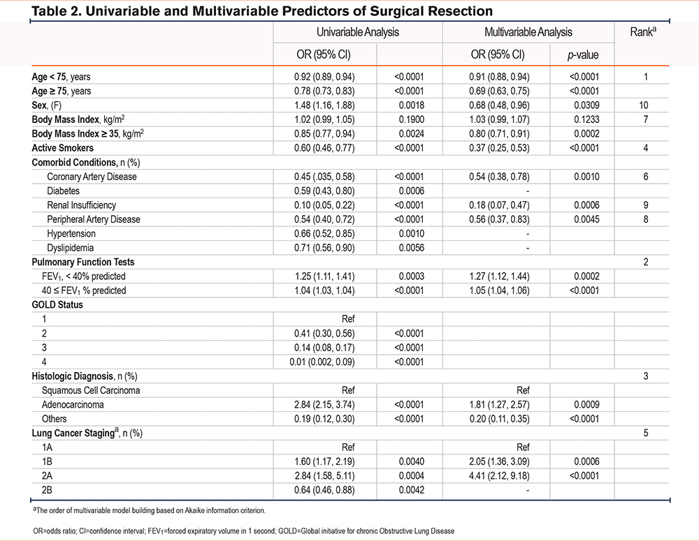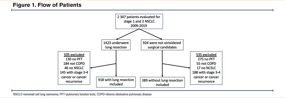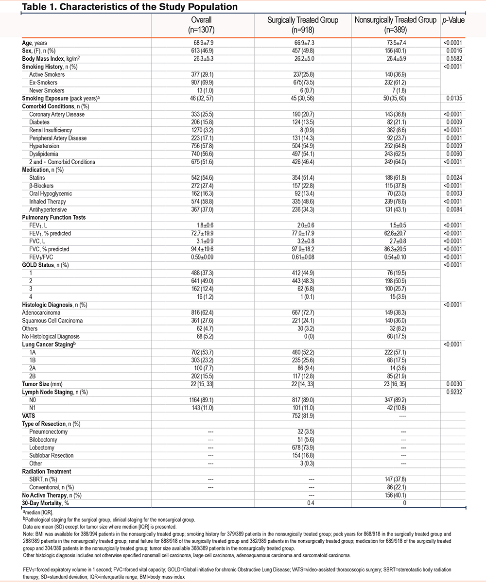 Accordingly, the objectives of this study were to: (1) compare the characteristics of patients with COPD who underwent surgical resection for early-stage NSCLC compared to a nonsurgical approach; (2) describe the predictors of lung resection in this population; (3) evaluate the impact of surgery on long-term survival; and (4) determine the mortality causes in this population.