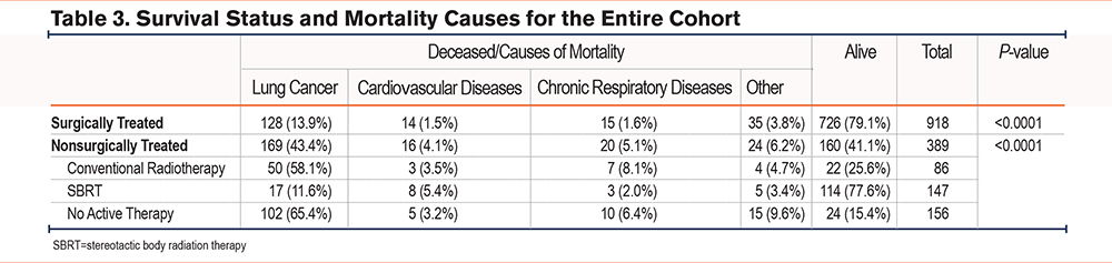 The causes of mortality could be ascertained from death certificates for the entire cohort (Table 3). The distribution of mortality causes differed between the 2 groups; excess in mortality due to lung cancer, cardiovascular diseases, and chronic respiratory diseases were noted in the nonsurgical group compared to surgically treated patients (p=0.001). Exploring the causes of mortality according to each type of nonsurgical treatment revealed an excess lung cancer mortality with conventional radiotherapy and therapeutic abstention but not with SBRT.
