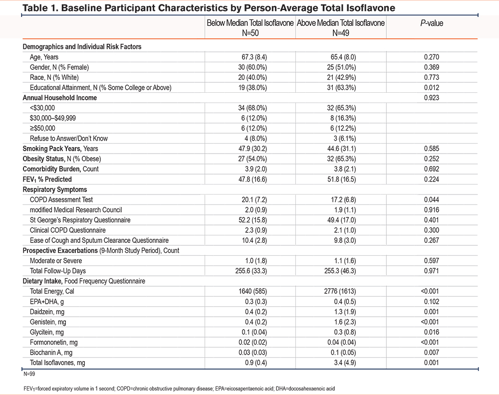 Diet and nutrition have increasingly been recognized as modifiable risk factors for chronic lung diseases such as chronic obstructive pulmonary disease (COPD). A “Western” dietary pattern, characterized by high intake of refined grains, red and processed meats, fried foods and sugar-sweetened beverages, has been associated with increased risk of COPD, increased respiratory symptoms, and lower lung function.1,2 Conversely, a Mediterranean or “Prudent” dietary pattern, characterized by high intake of vegetables, fruit, fish, poultry, and whole grains, was associated with a decreased risk of COPD. Specific dietary components that may explain the difference in lung health between these 2 patterns have also been investigated. As an example, increased omega-3 fatty acid intake has been associated with decreased COPD morbidity in terms of exacerbation frequency and symptom burden.3 Another potential contributor to this finding are isoflavones, phenolic compounds produced by legumes and found in foods such as tofu and soy milk. Isoflavone intake has been associated with decreased risk of other chronic diseases such as coronary heart disease, with one proposed mechanism being inhibition of inflammatory cytokine release which may similarly provide benefit in an inflammatory disease such as COPD. Additionally, isoflavones downregulate platelet activation, which is increased in COPD and has been associated with respiratory morbidity4; however, these relationships have not yet been studied.5,6