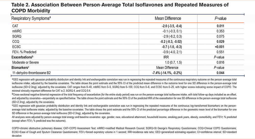 Notably, isoflavone intake was not significantly associated with the mMRC or prospective exacerbation rates. The mean difference in the mMRC was towards improvement in dyspnea, so it is possible that the current study was underpowered to detect a significant difference. On the other hand, since the mMRC is a measure specifically of dyspnea, the proposed anti-inflammatory and antiplatelet mechanisms of isoflavone intake may impact respiratory morbidity primarily through improved of cough and sputum production rather than through dyspnea. Regarding exacerbations, it is possible that the effect of isoflavone intake on respiratory morbidity can modify day-to-day symptoms, but that the associated anti-inflammatory and antiplatelet effects are too modest to modify the course of an exacerbation triggered by a respiratory infection or significant environmental exposure.