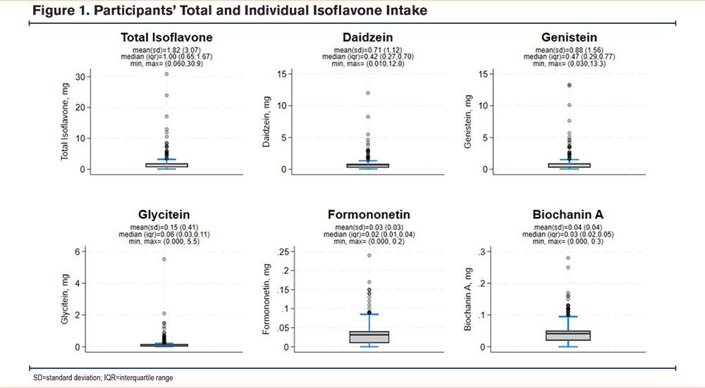 Isoflavones, which can be found in soybean and soybean products, are phytoestrogens – naturally occurring phenolic plant compounds that resemble estrogens.20 Daidzein and genistein account for the bulk of isoflavone intake in humans, with their primary dietary source being soybeans and soybean products. Glycitein is likewise found in soybeans, but in smaller quantities and appears to be less potent biologically. Formononetin and biochanin A are primarily found in red clover – not a typical part of the human diet beyond phytoestrogen supplements – and are converted in vitro into the more potent daidzein and genistein.21 Data from the National Health and Nutrition Examination Survey show that isoflavone intake is higher among individuals with higher family income.22 Our cohort represents a relatively lower income population and isoflavone intake among participants in our cohort was slightly lower than the national average for all individuals and similar to intake among individuals with family income levels under 131% of the federal poverty level.23
