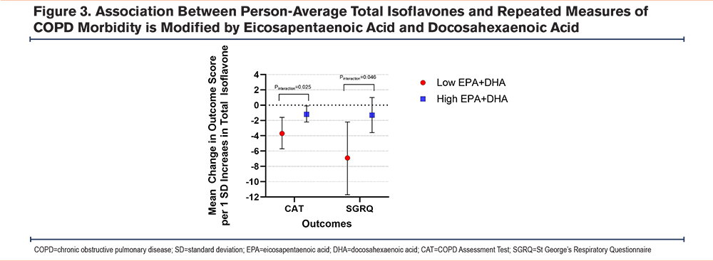 In sensitivity analyses, the association of increased isoflavone intake with better respiratory morbidity was robust to adjustment by omega-3 fatty acid intake. However, there was a significant 2-way interaction between total isoflavones and person-average omega-3 intake (EPA + DHA) for CAT and SGRQ scores, such that the beneficial association of isoflavone with CAT and SGRQ was more marked at lower omega-3 intake (Figure 3).