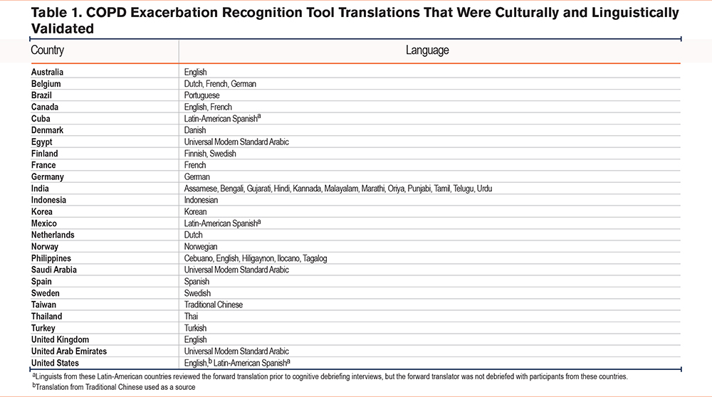 This study cross-culturally and linguistically validated 46 CERT translations across 25 countries and 6 continents. The CERT is easy for patients to understand, and the translations can be considered to be equivalent regardless of country or language. These translations may support health care professionals in multiple global regions in educating patients to recognize and act upon early signs of a COPD exacerbation.