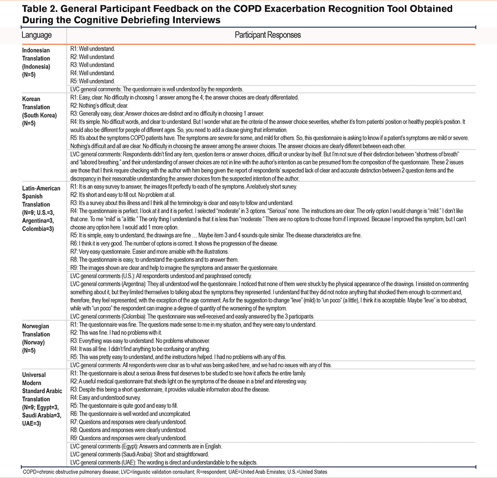A total of 212 participants with COPD were involved in the whole translation program across all 46 CERT translations. An overview of the demographics and characteristics of participants included in the cognitive debriefing interviews for 5 CERT translations are included in Supplemental Table 2 in the online supplement.