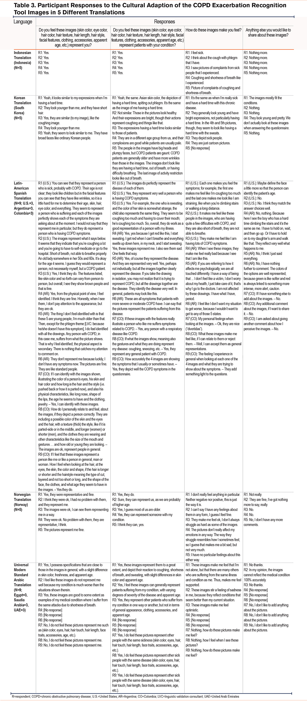 Of the 30 participants who provided responses to all questions in the cognitive debriefing interviews of the Universal Arabic, Korean, Indonesian, Norwegian, and Latin-American Spanish translations of the CERT, 24 (80.0%) agreed that the images were representative of themselves (Table 3). In particular, participants commented that the presentation of the symptoms in the CERT corresponded to how they and/or other people with COPD usually appear when experiencing the same symptoms. A total of 4 (13.3%) participants who did not find the images to be representative of themselves responded that the images were likely to represent other patients with COPD instead. However, 4 participants (13.3%) commented that people in the images looked younger than themselves and/or other people with COPD.